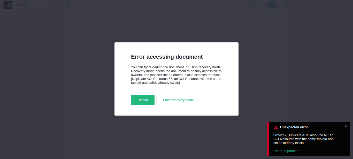 I can’t access my documents when updating to version 1.7.1 on my own server. The error message is as shown in the screenshot. I can enter recovery mode but can’t do anything. I’ve tried downloading the documents and re-importing them, but it still doesn’t work. All I can do is put the documents in Grist on another server with a lower version (e.g., 1.1.1).