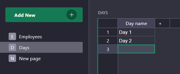 The most straightforward way to do it is to create a new empty table with a column “Employee” which is a reference to the employee table, and a column “Day” which is a reference to the Day table.