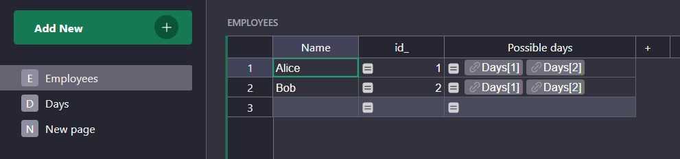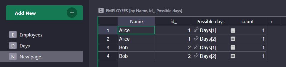 Days.lookupRecords() - Create a new view. Select the “Employee” table and aggregate with “Name” and “Possible_days”