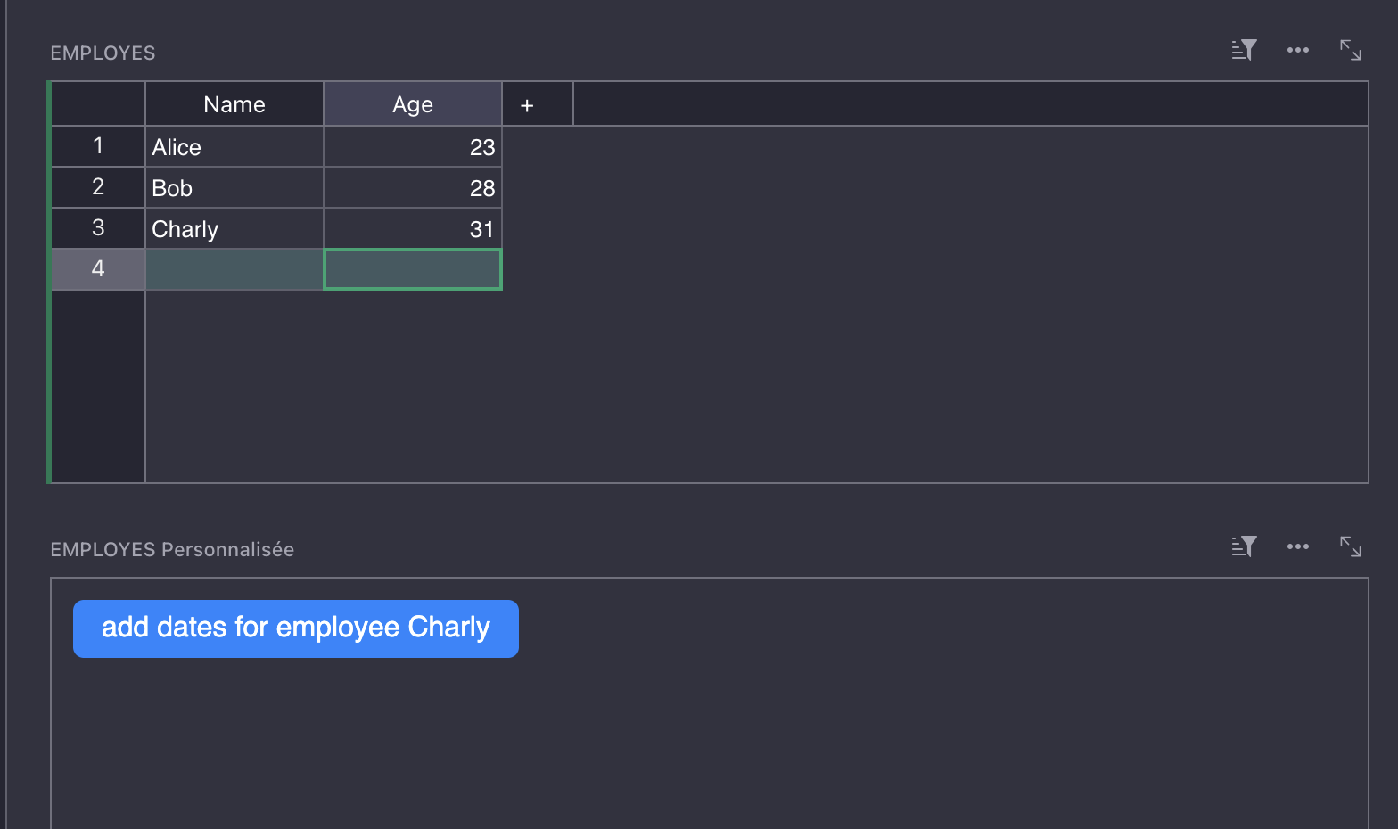 The first solution I implemented to make sure I have all possible combinations was to use the “action button” widget. In the “Employee” table, you can create a button that will create all dates FOR A SPECIFIC EMPLOYEE. You can open a view with the “action button” widget next to the Employee table, and put this use this code in the Action column: