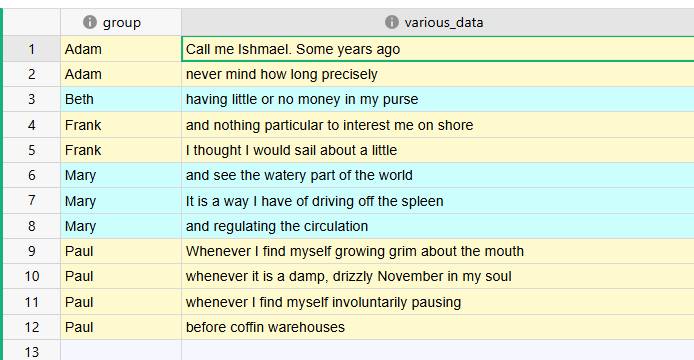 Now, if you are sorting by, say, a numeric column, that’s easy: you just write a condition like $my_column % 2 == 0 to alternate between even and odd values of the column. However, when your target column has arbitrary values (like the names in the “group” column above) this gets a little tricky.