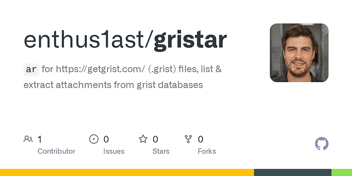 GristAr is a command-line utility designed to manipulate, list, and extract attachments from .grist database files. Think of it as ar or sqlar, but specifically tailored for the Grist internal storage schema.