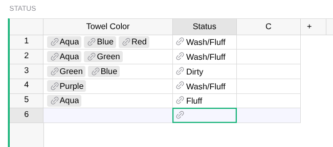 I am struggling with how to create a summary table based on a source with a multi-pick cell. Below is an image of the source table. I want to create a new table that summarizes which towels are dirty. The fluff variable can be ignored. Programmatically, I think that it would be something like: if count(blue[dirty]) > count (blue[Wash/Fluff]) then it is dirty. I have tried a number of different options, and the references seem to break things.