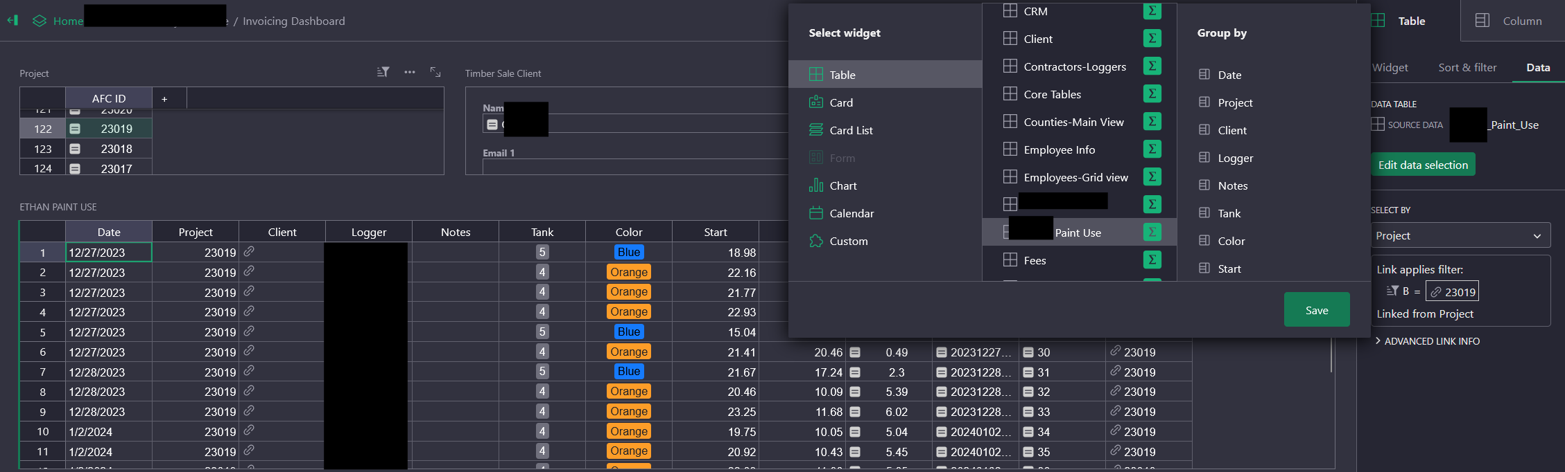 I have a Projects table displayed as a widget on the invoicing page, which I use to select the project I’m invoicing.