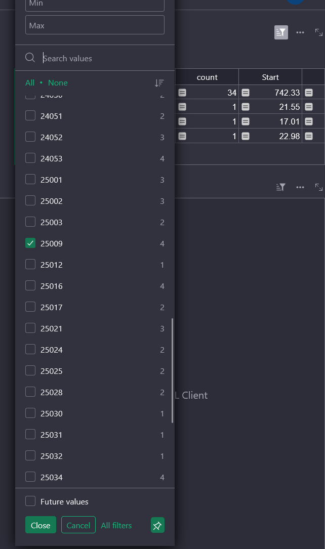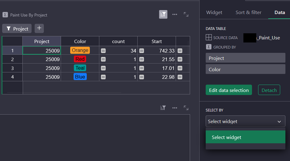 - But I have not been able to get a grouped summary table (Project × Color) to dynamically react to the selected Project. I am unable to utilize the Select By feature for any widget for the grouped summary table.