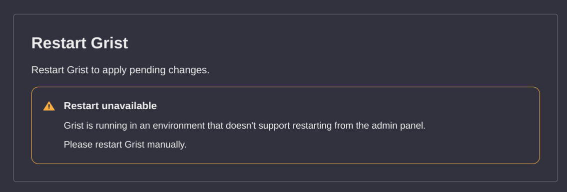 I’ve just installed the Flatpak version of Grist Desktop on my Nobara Linux system. I went into the admin panel to change the auth to ‘Login with getgrist.com’. I pasted in the key and it requires a reboot, however it says that this environment doesn’t support restart from admin panel.